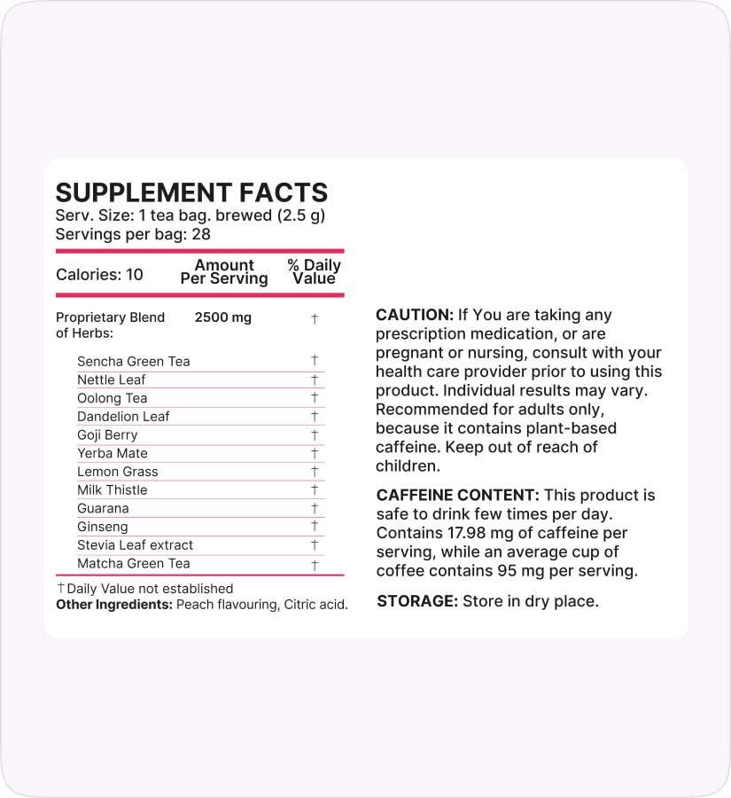 Our tea blend includes: Matcha Green Tea, Yerba Mate, Oolong Tea, Sencha Green Tea, Dandelion Leaf, Ginseng, Milk Thistle, Nettle Leaf, Lemongrass, Goji Berries, Citric Acid & Stevia